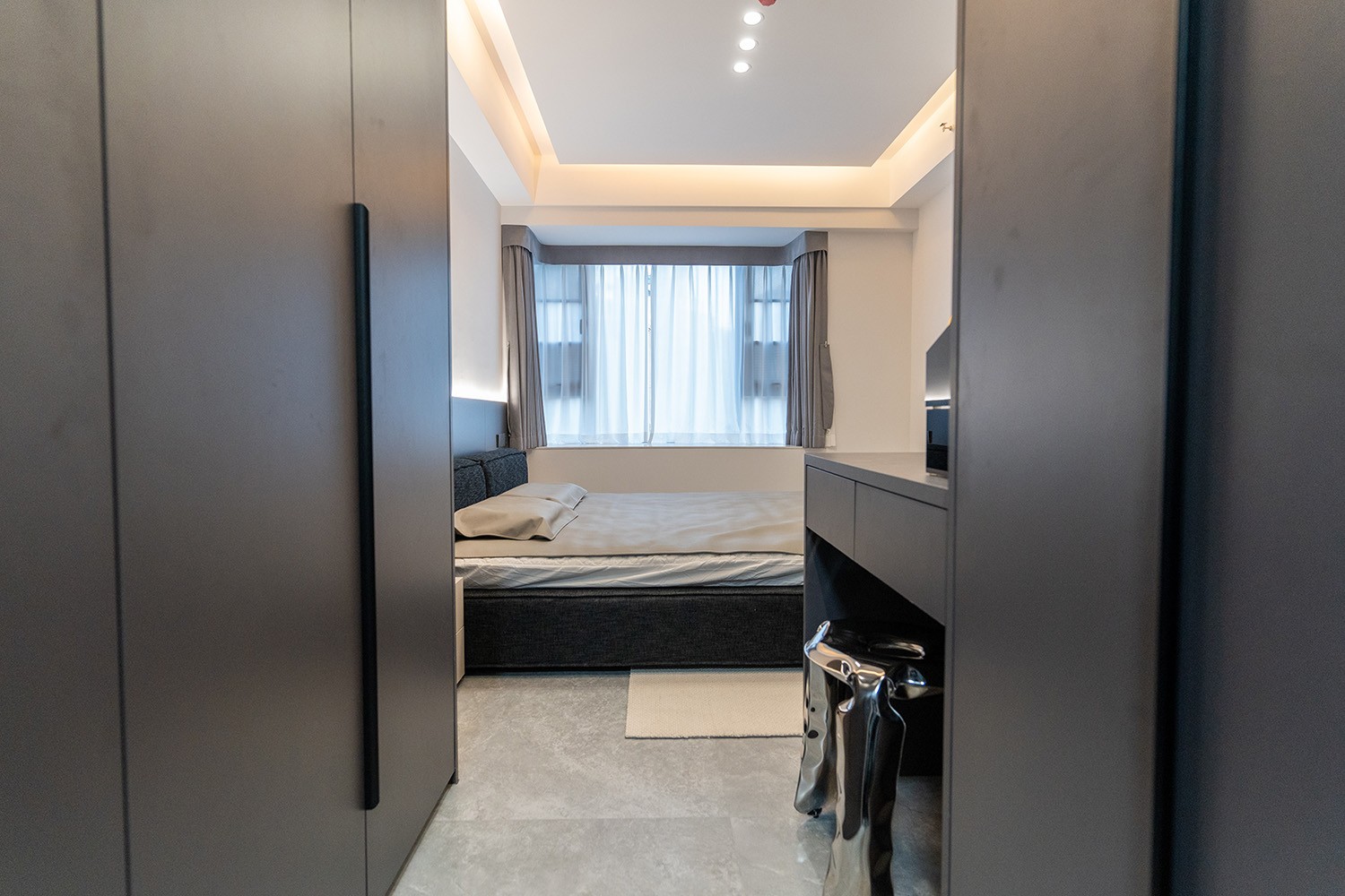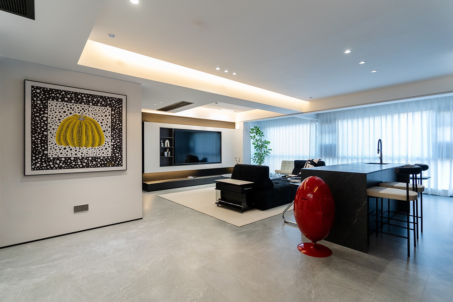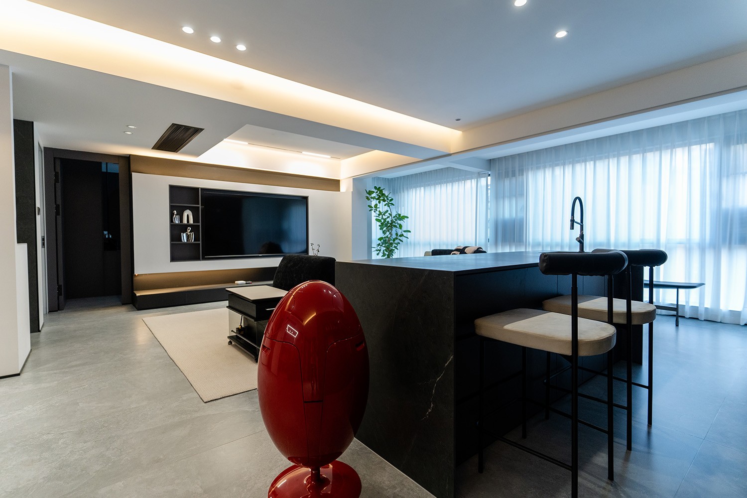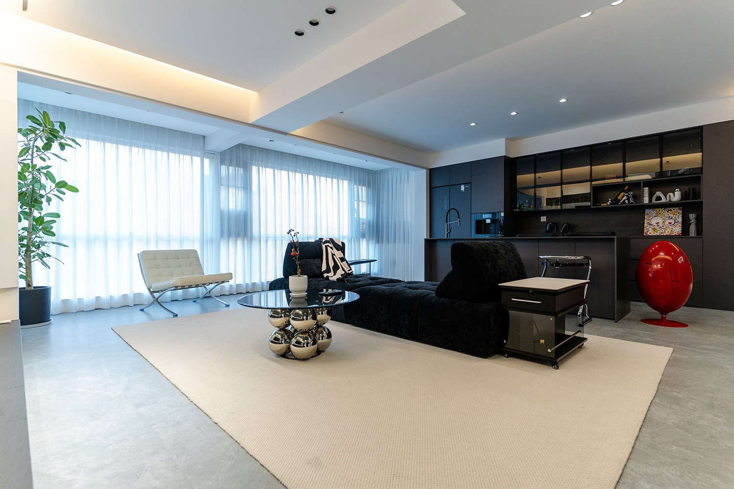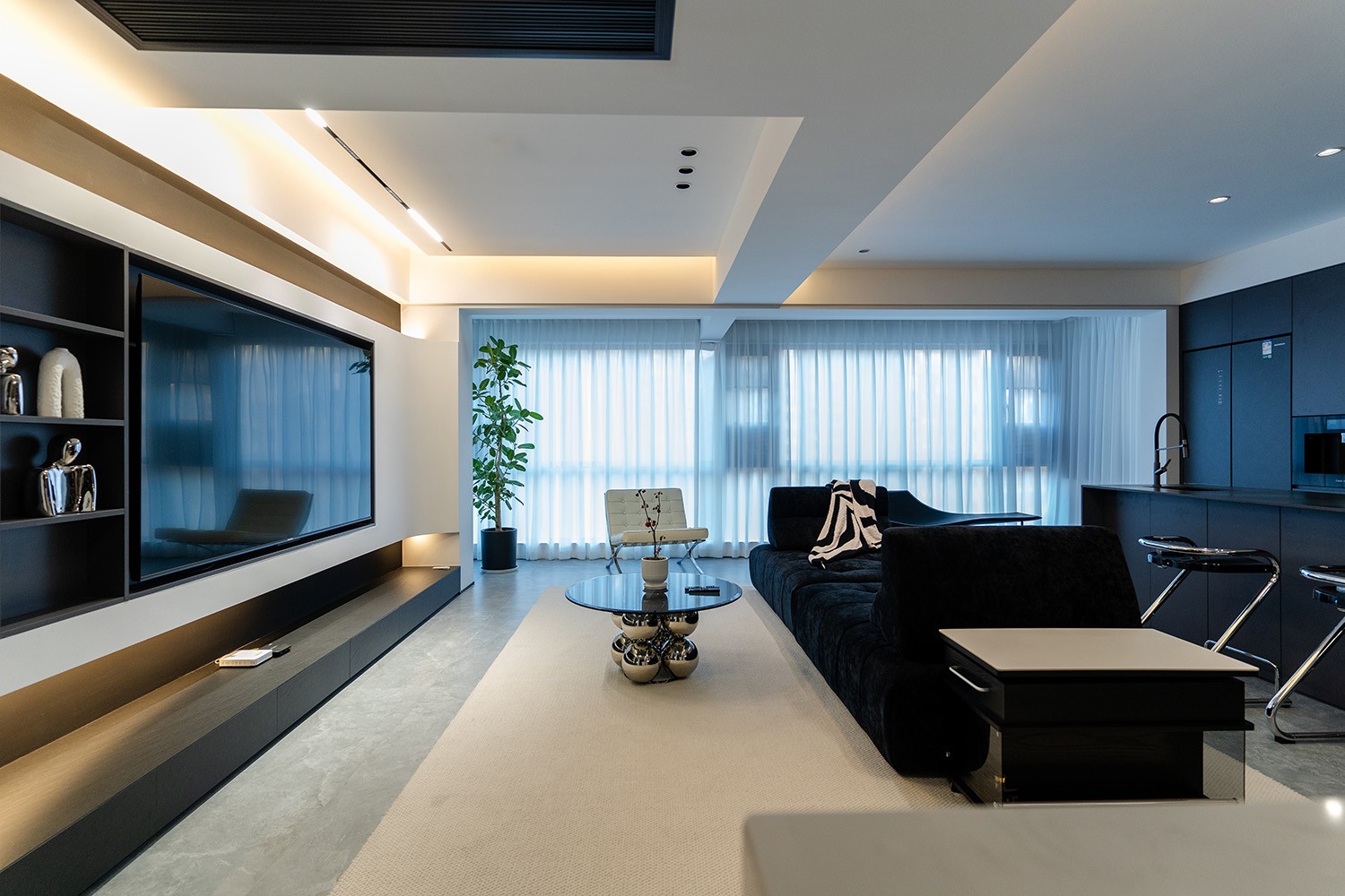 黑白灰極簡(jiǎn)風(fēng)格,是理性美學(xué)與純粹生活的完美統(tǒng)一。它剝離了色彩的干擾,通過(guò)最純粹的色調(diào)、最精準(zhǔn)的比例與最豐富的材質(zhì)肌理,構(gòu)筑一個(gè)冷靜、高級(jí)且充滿(mǎn)內(nèi)在秩序的居住空間。本案以朗悅臺(tái)120平方米的戶(hù)型為載體,深度解析如何駕馭這組“無(wú)彩色”的王者,在都市高層住宅中打造一個(gè)既能俯瞰江景、又能安頓身心的靜謐庇護(hù)所。 本案的核心設(shè)計(jì)理念是 “理性秩序,感性溫度” 。設(shè)計(jì)追求一種“消隱的設(shè)計(jì)感”,通過(guò)嚴(yán)謹(jǐn)?shù)臉?gòu)圖與色彩控制,展現(xiàn)高度理性的秩序之美。但極簡(jiǎn)不等于冷峻,在黑白灰的框架內(nèi),通過(guò)材質(zhì)的溫度、光影的變幻與線條的韻律,注入感性的生活氣息,最終達(dá)成一種冷靜與溫暖、簡(jiǎn)約與豐富的微妙平衡,讓居者在俯瞰窗外湘江美景時(shí),內(nèi)心亦能回歸寧?kù)o與本真。