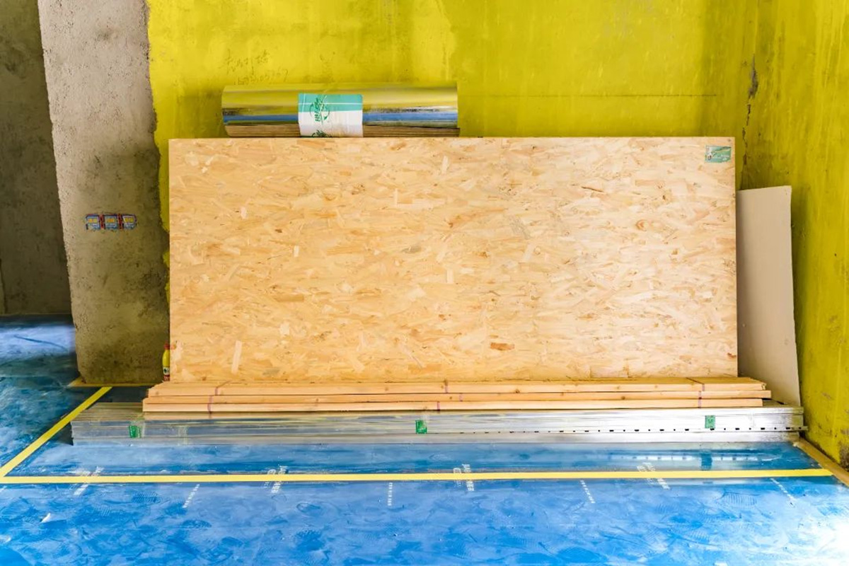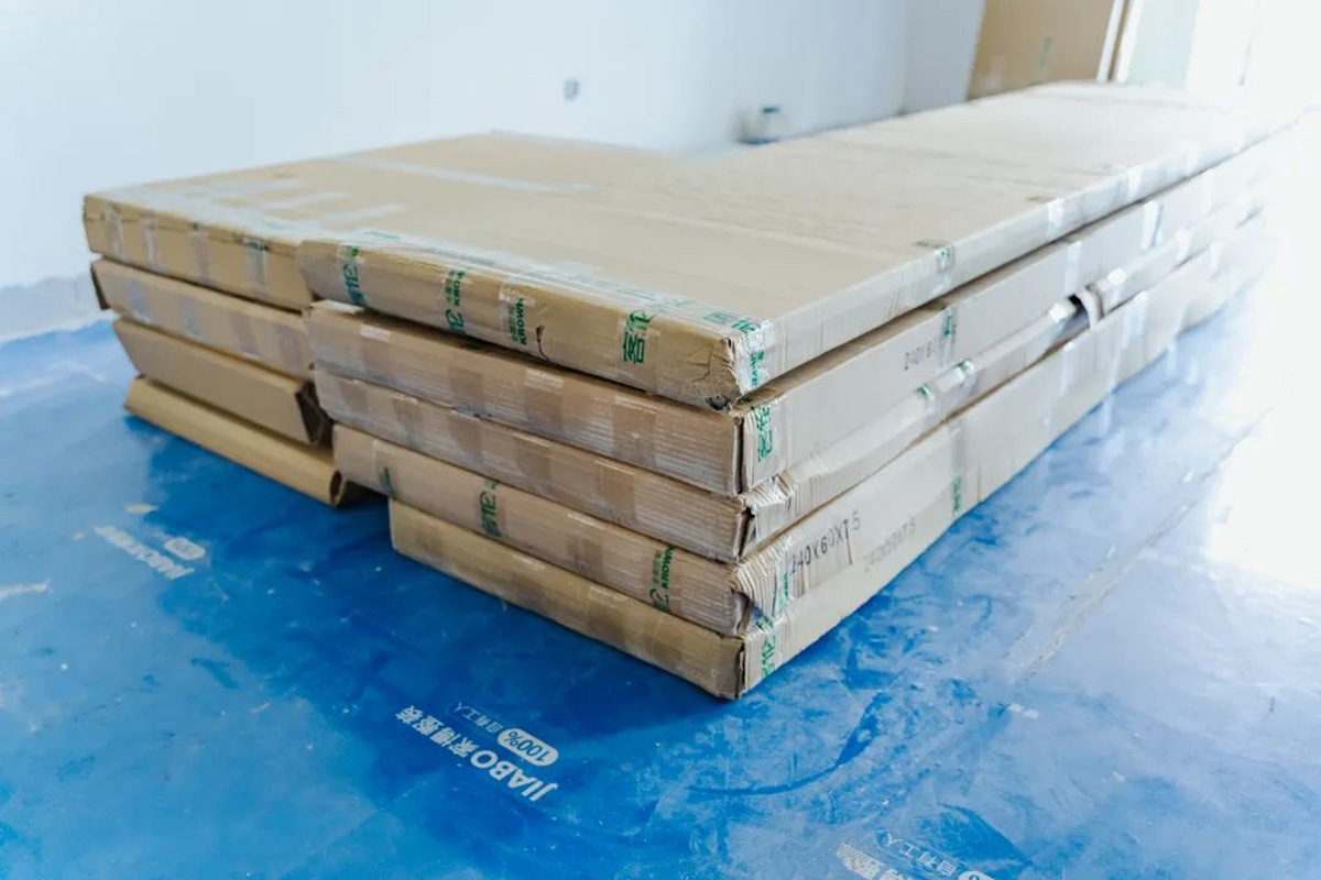 水電位置張貼警示條,后期打孔可以避開(kāi)水電位置;板材并排碼放整齊,均放置在黃框內(nèi),一目了然。